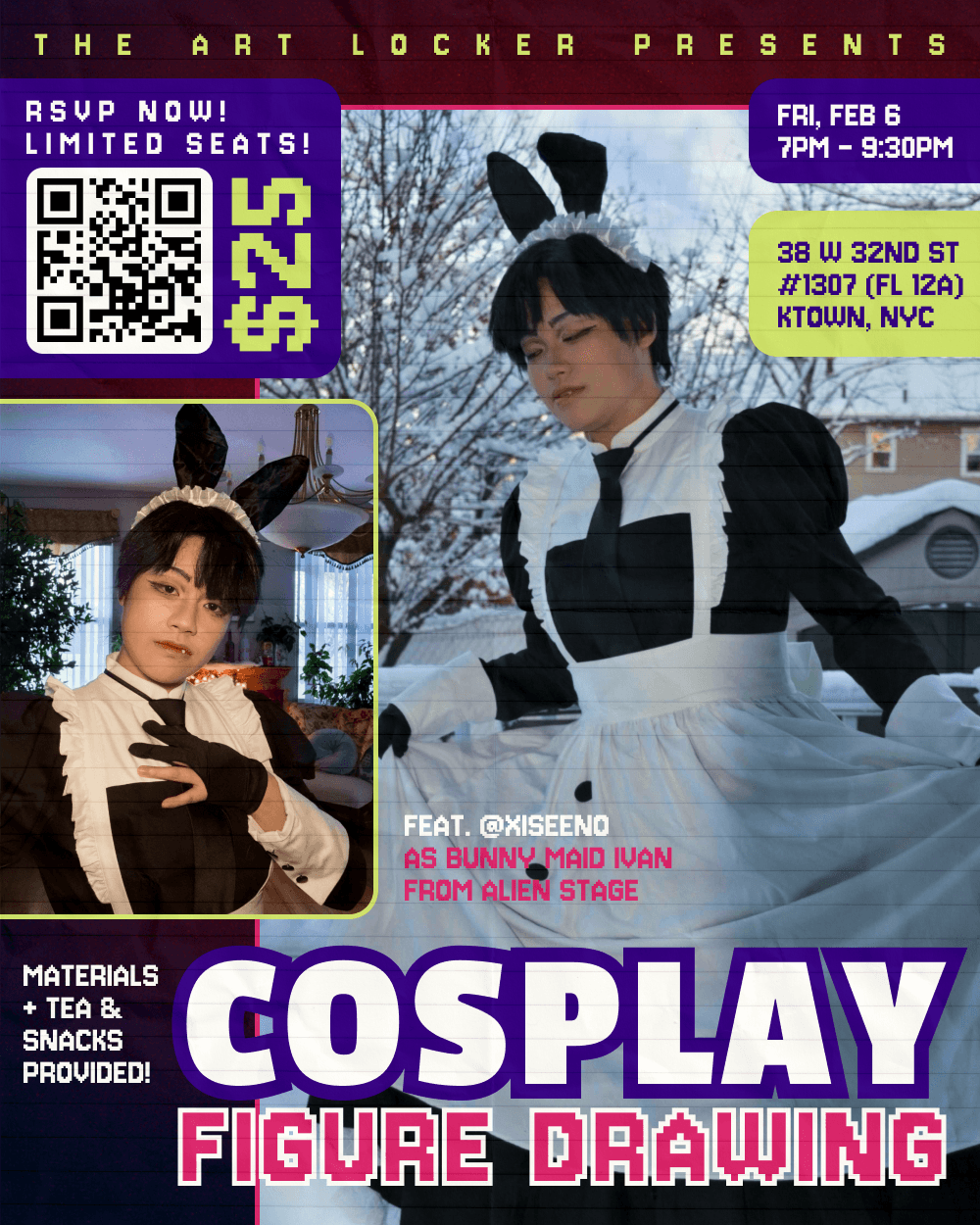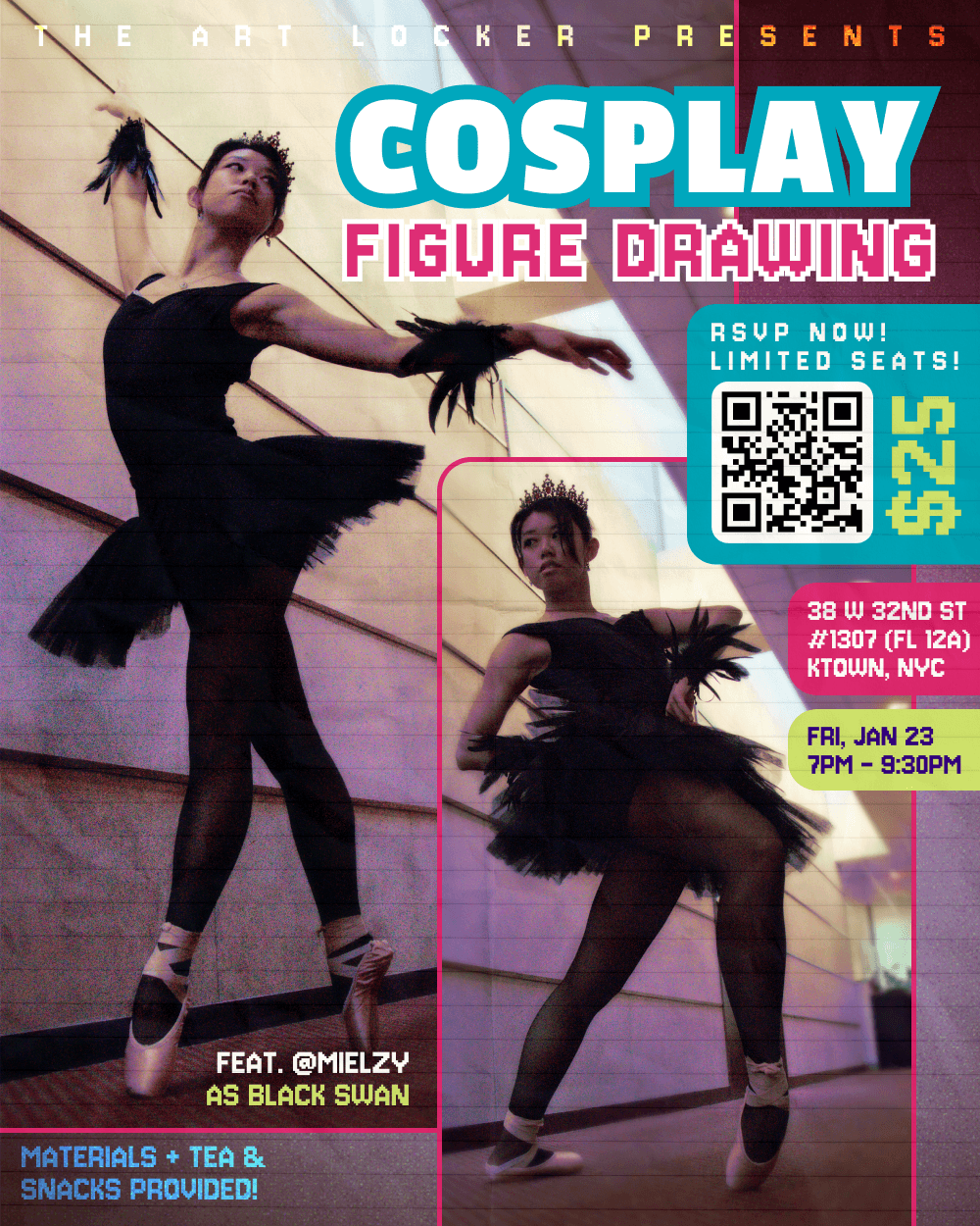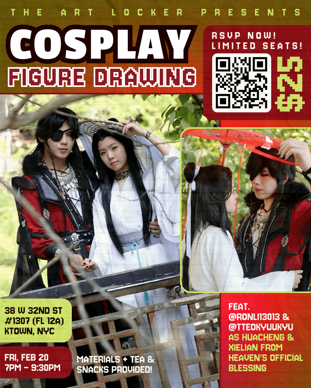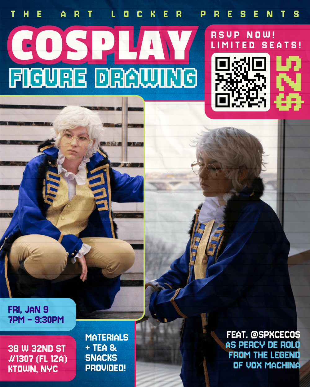 You heard right! We’ll be giving away 2 tickets to Cosplay Figure Drawing every month in order to make them more accessible! We are hoping that these giveaway tickets will go to attendees who might otherwise not be able to participate due to financial hardship. We will not ask for proof of such, and trust that you will allow those who really need it to take advantage of this giveaway.